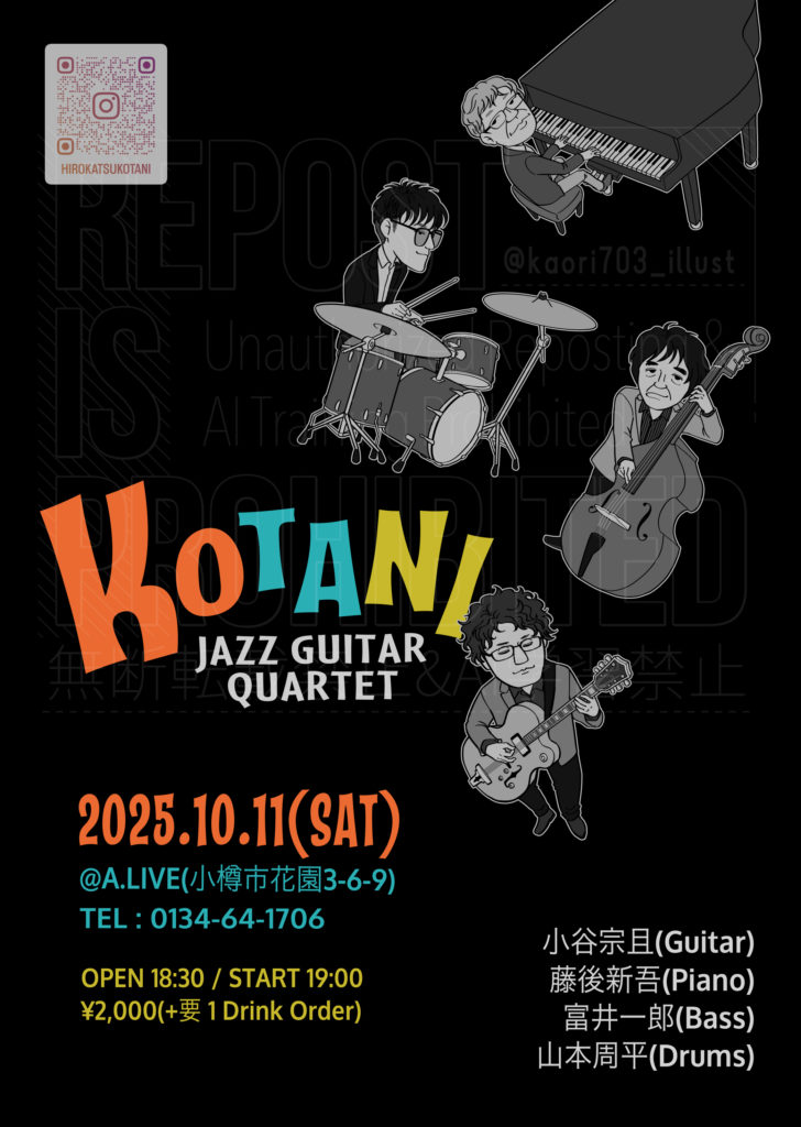 最近のコメント 表示できるコメントはありません。 ジャズライブ「KOTANI JAZZ GUITAR QUARTET」フライヤー クライアントワーク 2025.10.06 2025年10月11日に北海道小樽市「A.LIVE」にて行われるジャズライブ「KOTANI JAZZ GUITAR QUARTET」のフライヤーを制作いたしました。 出演者4名を似顔絵にいたしました。 制作データ 使用媒体フライヤー受注点数1点制作日数10日画材 / 使用機材Clip Studio Paint / iPad Pro / Adobe Illustrator寸法4093×5787px納品形態JPEG