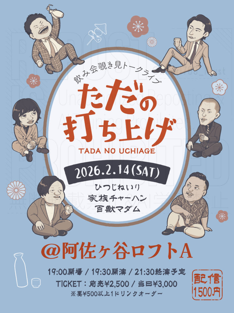 最近のコメント 表示できるコメントはありません。 お笑いライブ「ただの打ち上げ」フライヤー クライアントワーク 2026.02.072026.02.15 2026年2月14日に「阿佐ヶ谷ロフトA」にて行われるトークライブ「ただの打ち上げ」のフライヤー(会場印刷用、SNS掲載用)を制作いたしました。 制作データ 使用媒体フライヤー、SNS受注点数2点制作日数10日画材 / 使用機材Clip Studio Paint / Adobe Illustrator / iPad Pro / iMac寸法2894×4093px(フライヤー)2976×3969px(SNS)納品形態JPEG