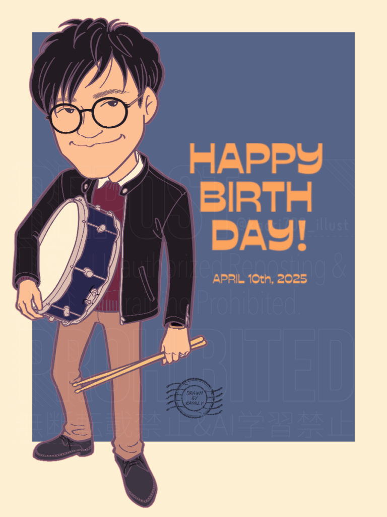 最近のコメント 表示できるコメントはありません。 似顔絵イラスト 個人制作(その他) 2025.07.04 知人の誕生日祝いに、似顔絵イラストを制作いたしました。 制作データ 制作日数3日画材 / 使用機材Clip Studio Paint / iPad Pro寸法900×1200px納品形態JPEG